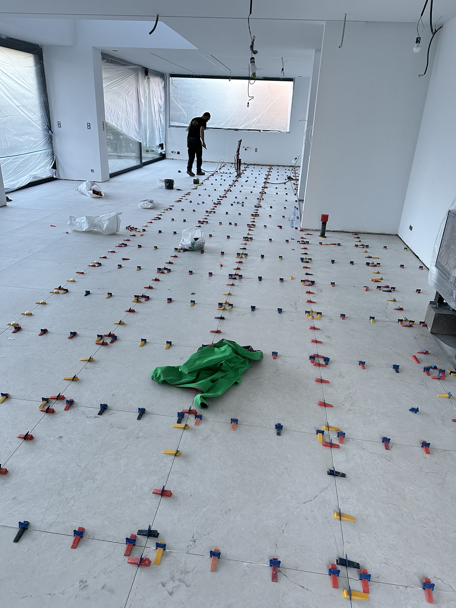 Installation of large format floor tiles in a modern residential interior, ensuring precise alignment and a seamless finish.