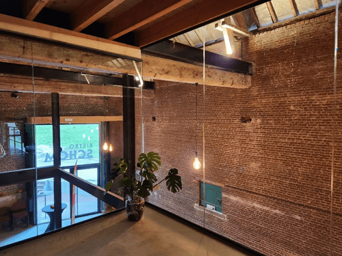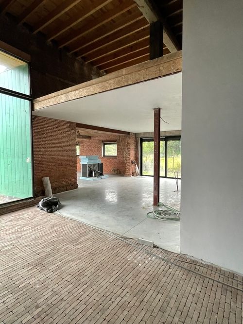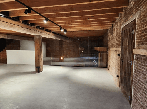 The renovation focused on preserving the original structure and materials while adapting the space to its new function. Existing brick walls, timber beams, and generous volumes were retained and highlighted, creating a strong dialogue between the building’s past and its contemporary use.