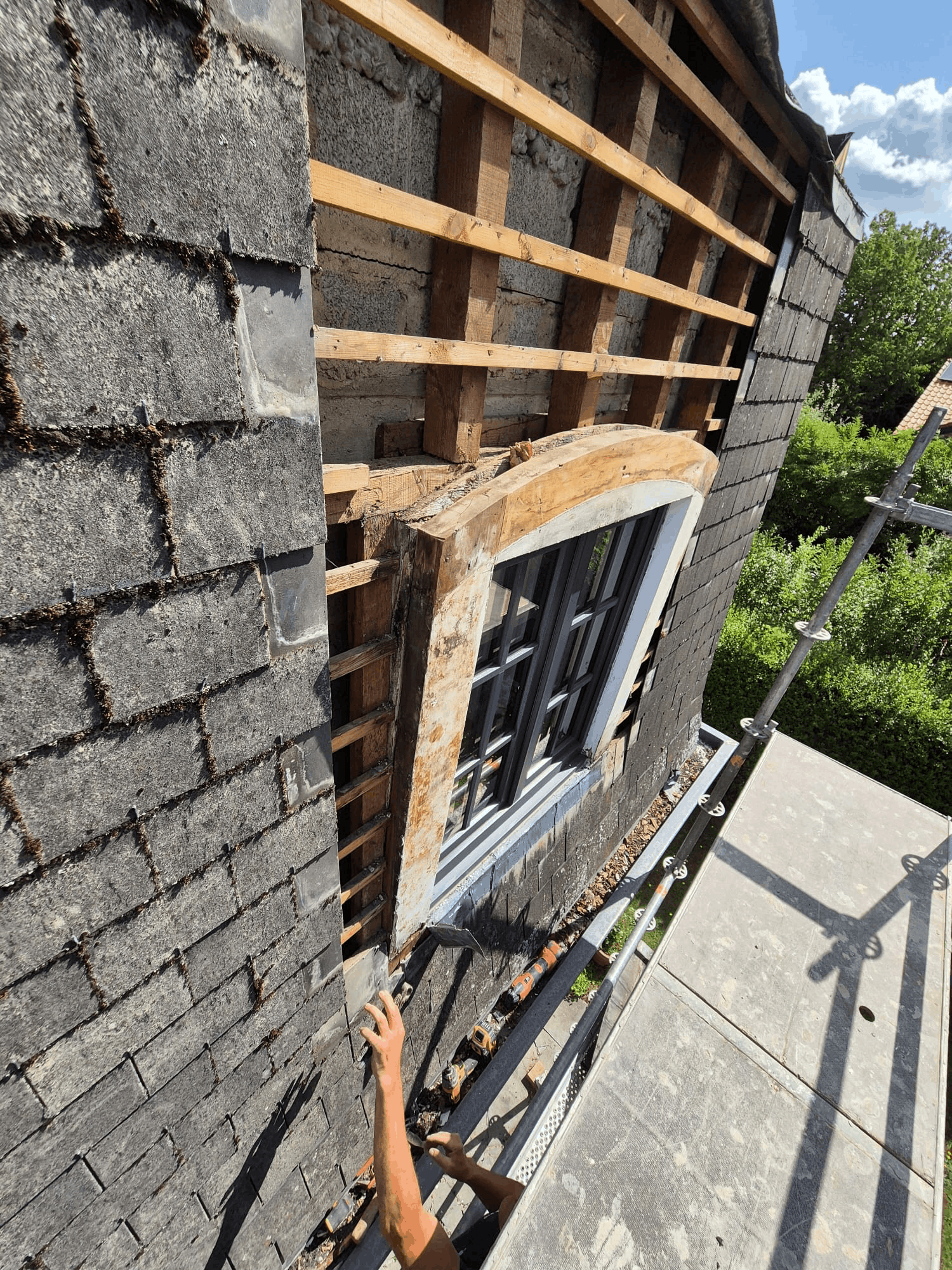 The original elements were damaged and beginning to fail, affecting both the appearance and the weather protection of the façade. We carefully removed the defective sections, rebuilt the necessary structural support, and installed new custom-made elements adapted to the existing architecture — including the curved upper section.